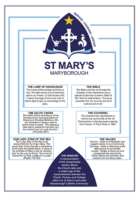 Our new Crest was created in 2020 to identify and reflect our rich history, connection to our church and founding orders. Through our shared vision, St Mary's is committed to building a strong faith community, guided by the Gospel values of Service, Courage and Justice.